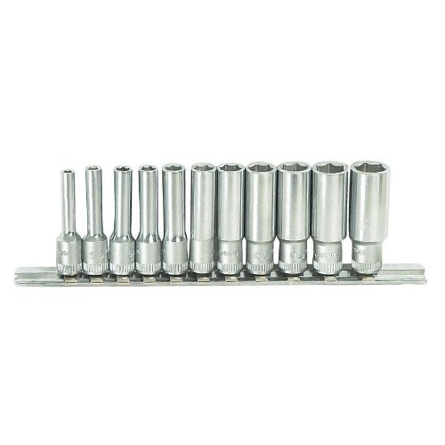 11 douilles longues 1/4" Longueur 50mm. Sur support metallique. Composition 4-5-5,5-6-7-8-9-10-11-12-13 mm.